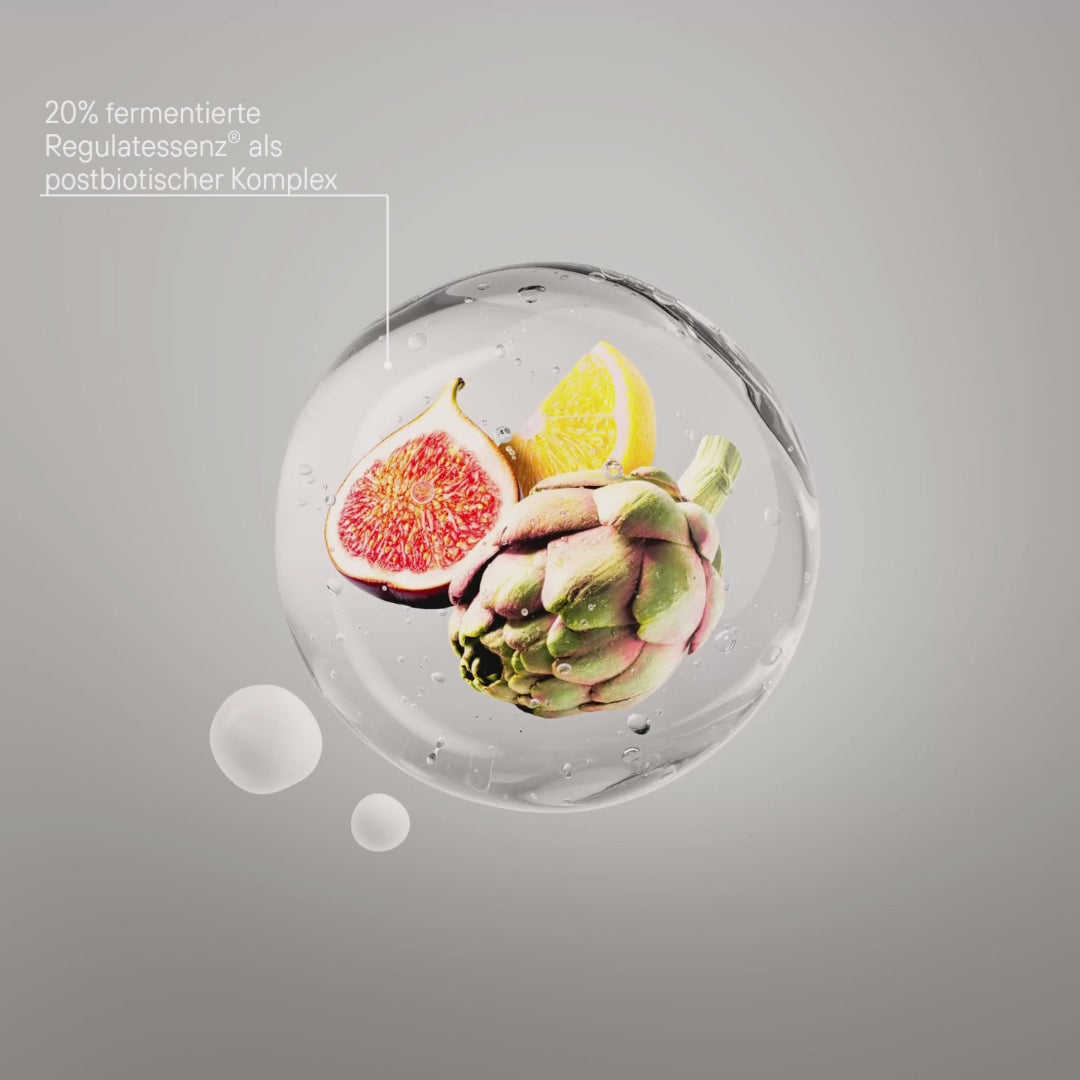 • Pre- and postbiotic complex of inulin and 20% fermented Regulatessenz: for a balanced and healthy skin microbiome and hydrated skin layers.