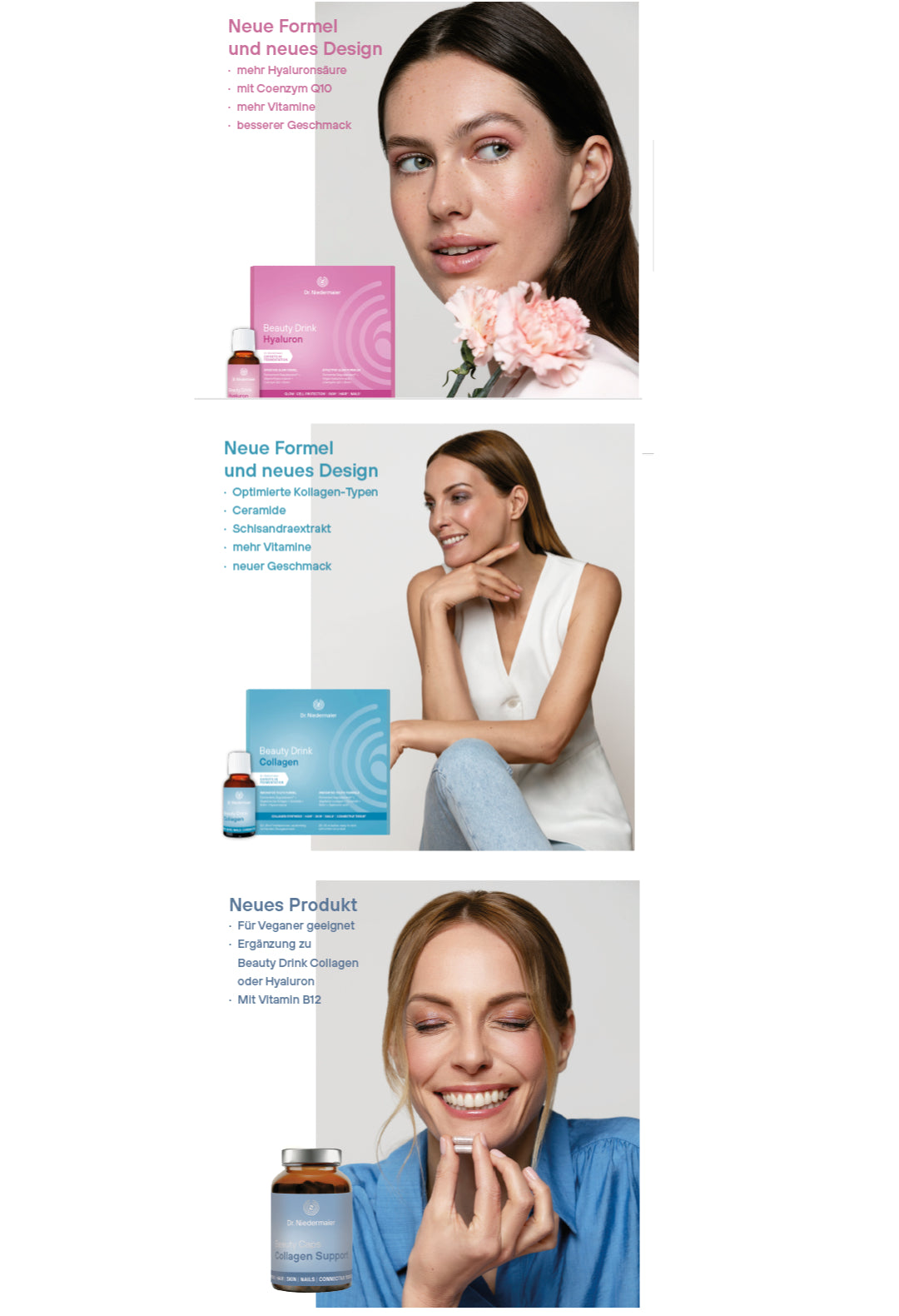 Dépliant de 10 pages sur la Nutricosmétique : Beauty Drink Collagen, Beauty Drink Hyaluron et Beauts Caps Collagen Support.